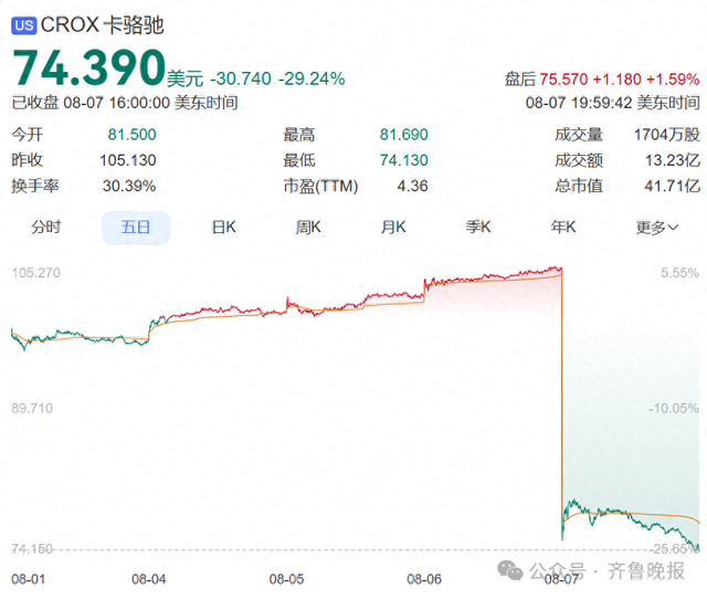 受此影响,Crocs股价整夜之间暴跌近30%,报收74.39好意思元,波及近三年来的最低点,亦然其近十多年来最大单日股价跌幅。总市值仅剩41.71亿好意思元。